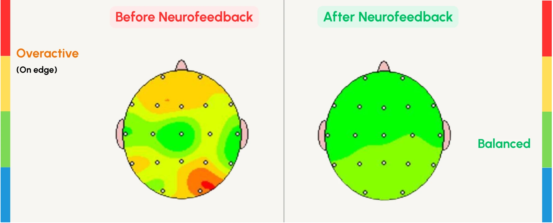 Most clients feel an instant ‘aha’ moment when they see how their brain is overactive in certain areas leading to symptoms like anxiety. With Neurofeedback we train your brain from being overactive to calm and balanced with non-invasive approach.